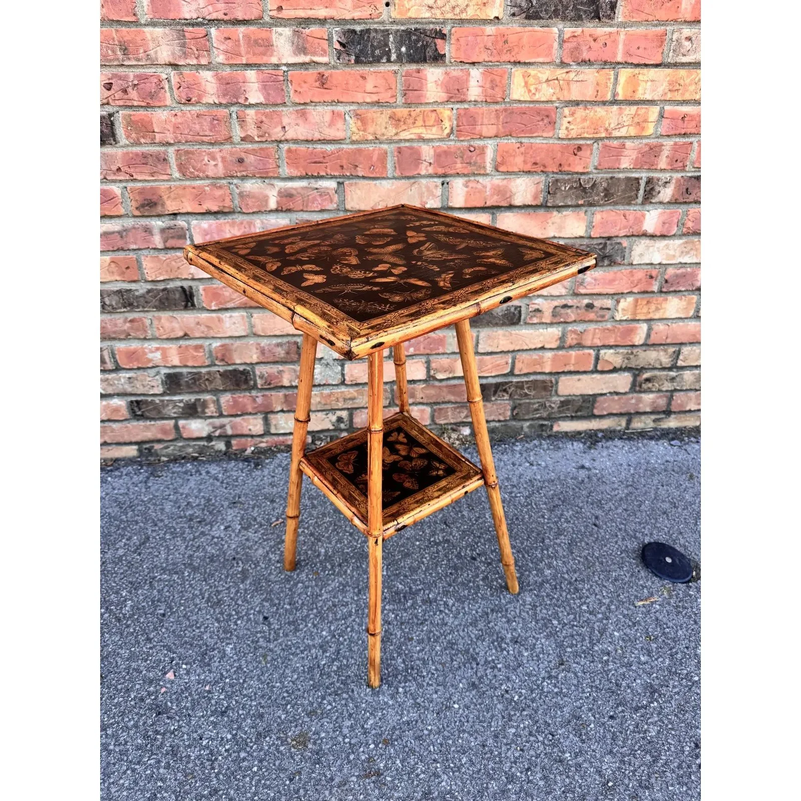 This 19th Century English Bamboo Side table features a delightful variety of butterflies decoupaged onto the top and lower shelf. This would make a sweet bedside, chair side or lamp or plant table, or anywhere you want to add an interesting display table.